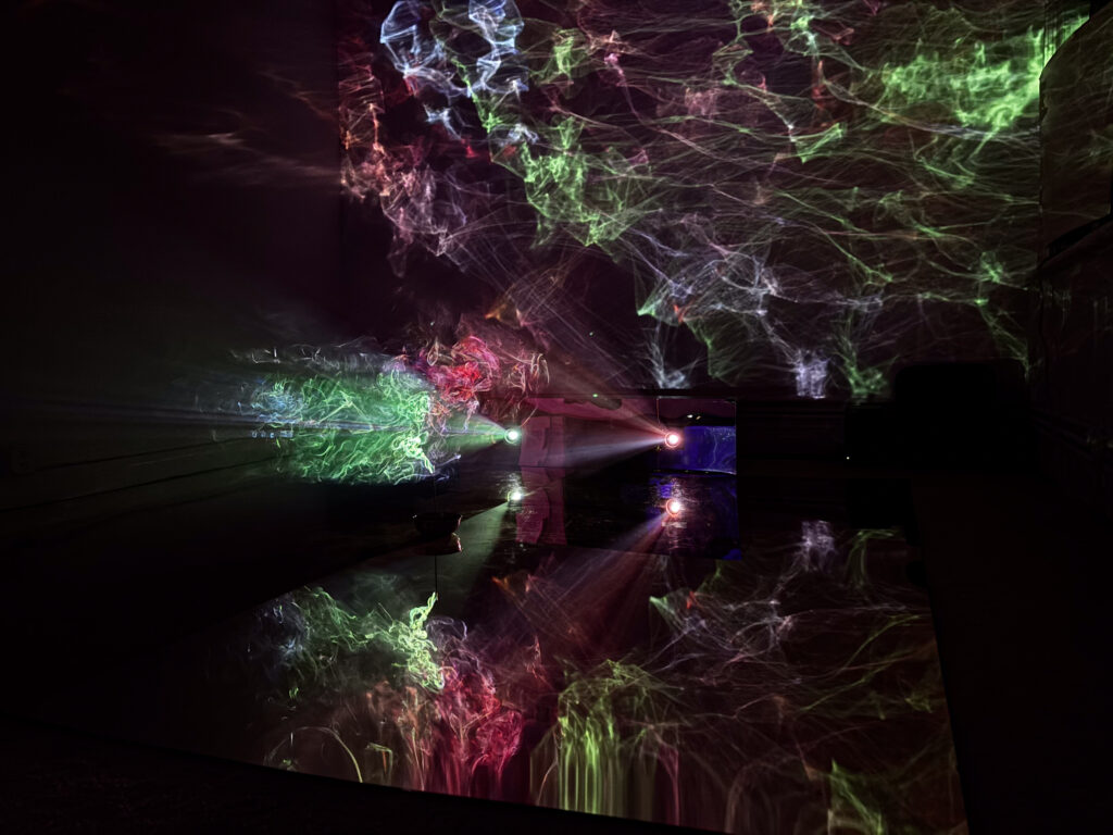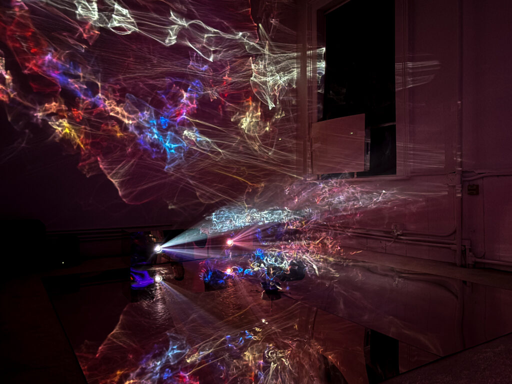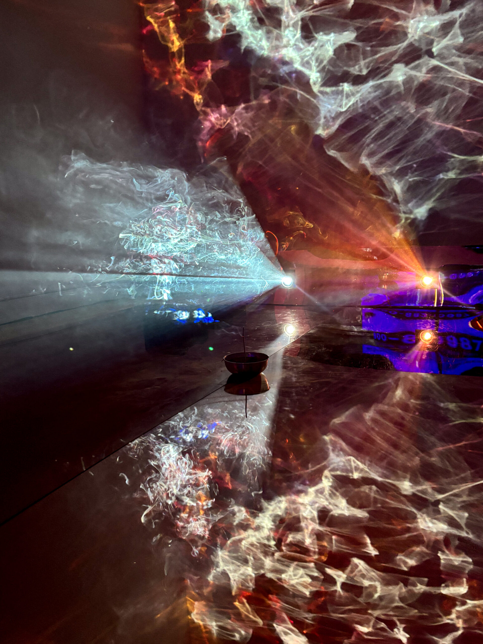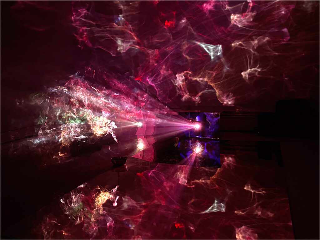 (2025); Installation view, mixed media: incense, CNN/Twitch live streams, video projectors, wood, acrylic sheets, colored gel. Dream House, MELA Foundation, New York, 2025. Photo: Jung Hee Choi. Copyright © Jung Hee Choi 2025.