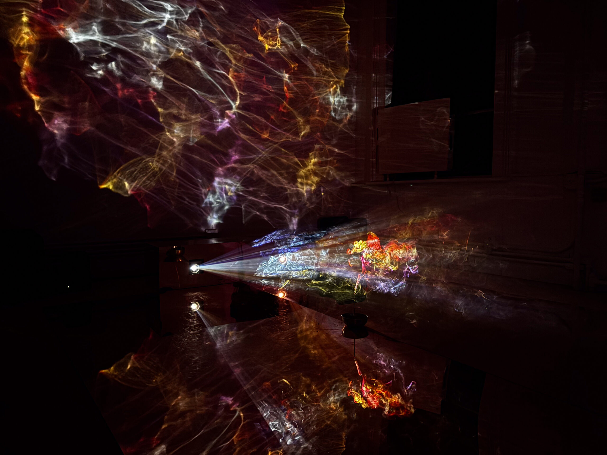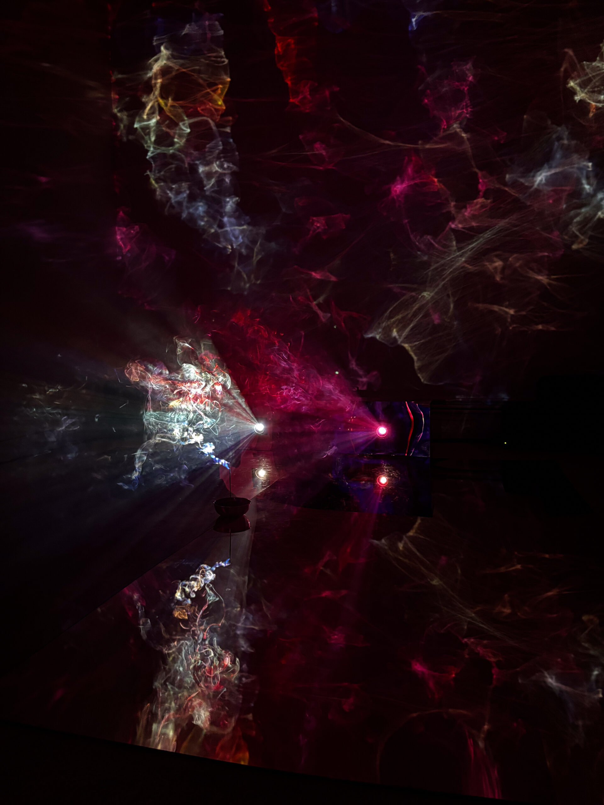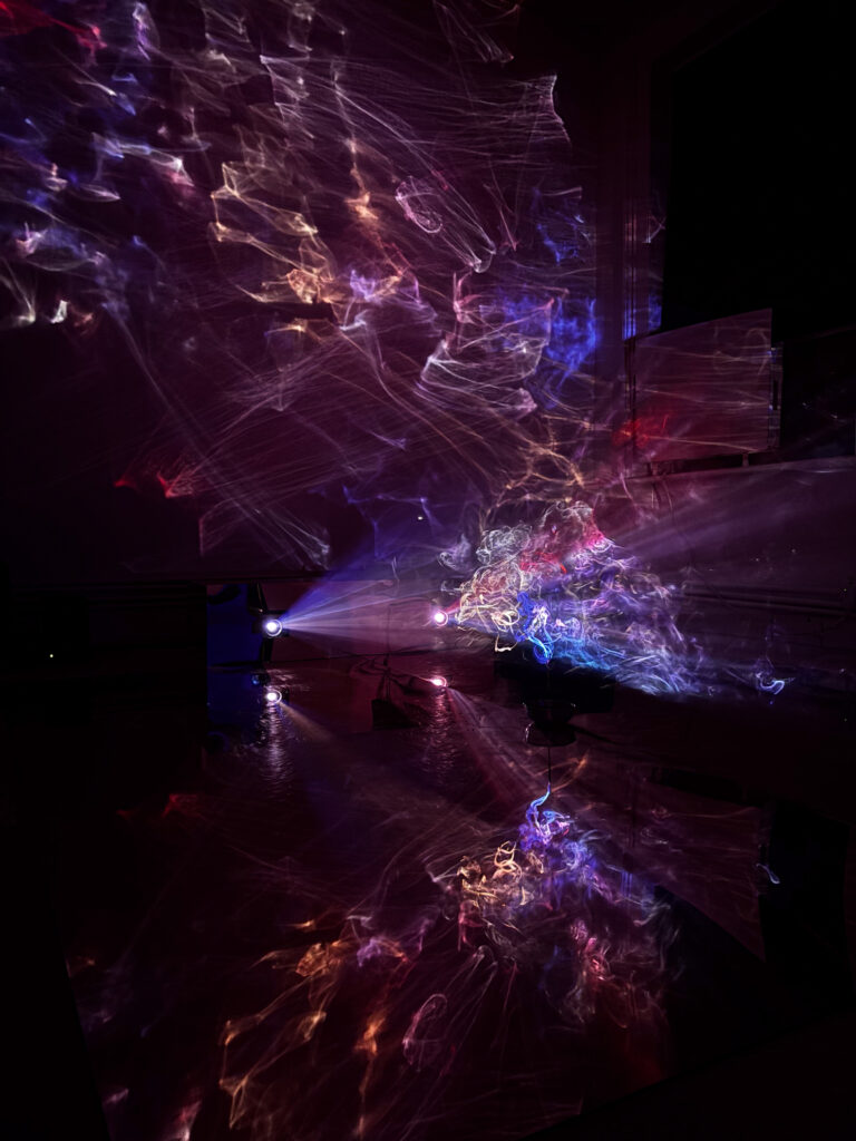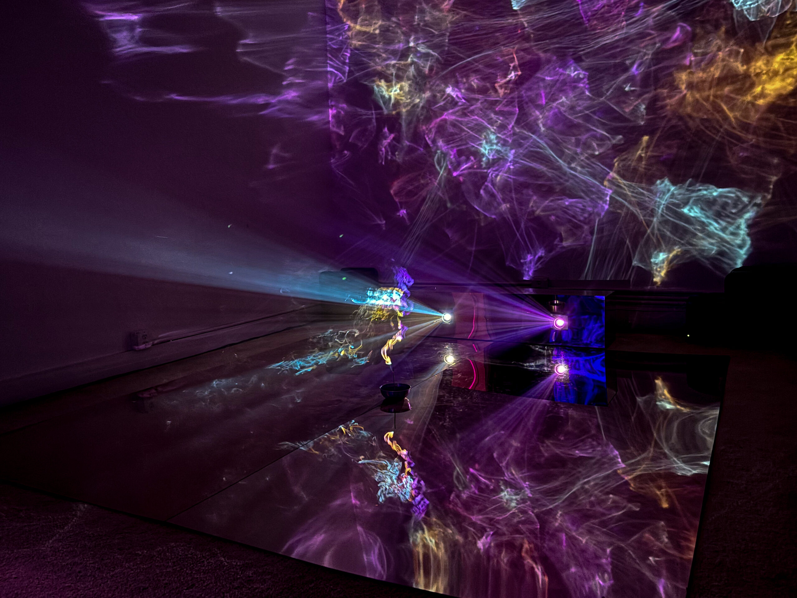 (2025); Installation view, mixed media: incense, CNN/Twitch live streams, video projectors, wood, acrylic sheets, colored gel. Dream House, MELA Foundation, New York, 2025. Photo: Jung Hee Choi. Copyright © Jung Hee Choi 2025.